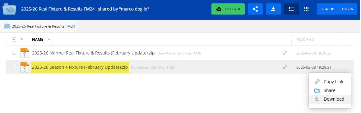 Click the arrow icon to the right of the link that says “2025-26 Season + Fixture (February Update)” and then click the download button as shown in the screenshot.