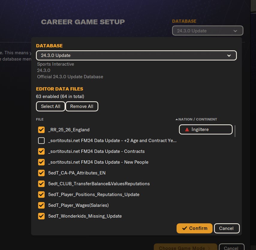 • Because Sortitoutsi’s UK file conflicts with the fixture patch, you will only need to select the fixture file. As shown in the screenshot, there shouldn’t be an exclamation mark. _RR_25_26_England.fmf file must be selected.