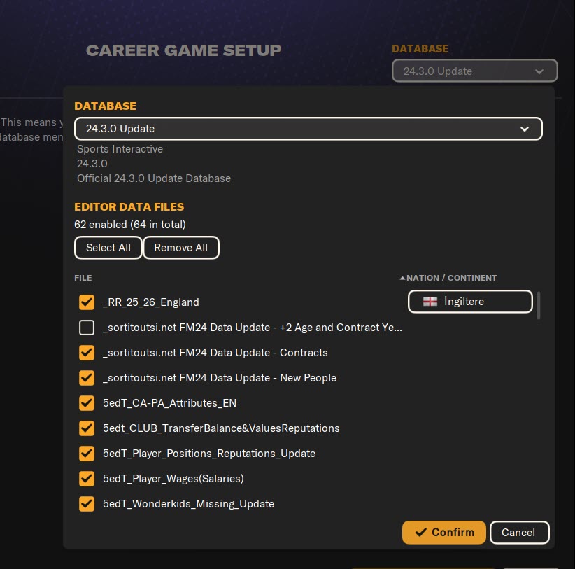 • If you don’t want the players’ birth dates to change by +2 years, uncheck the box next to “FM24 Data Update -+2 Age and Contract Years”. Since we start in 2025, this file is not necessary.